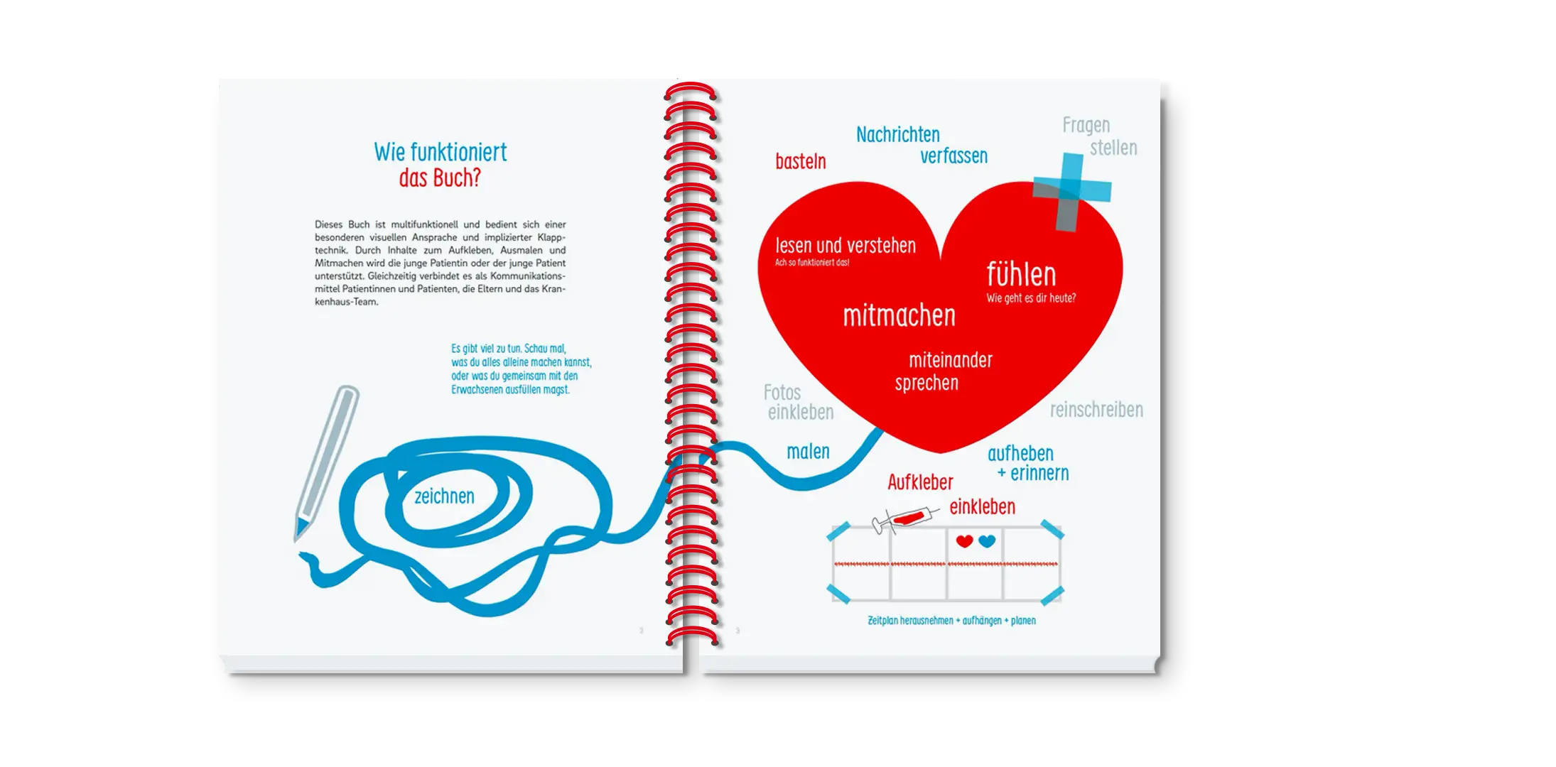 Unser Buch ist multifunktional und bedient sich einer besonderen visuellen Ansprache sowie einer implizierten Klapptechnik. Es bietet Inhalte zum Aufkleben, Ausmalen und Mitmachen, um junge Patient:innen zu unterstützen. Gleichzeitig fördert es den Austausch zwischen Patient:in, Eltern und dem Krankenhausteam. Unsere Eigenschaften umfassen: