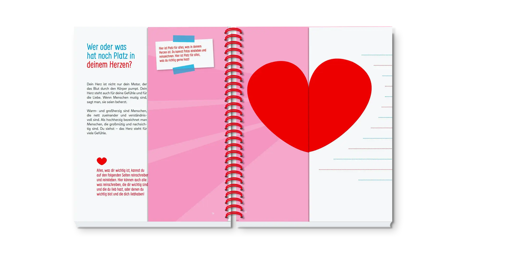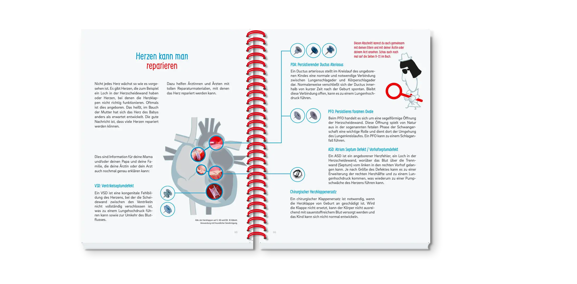 „Öffne Dein Herz – Herzmedizin“ ist ein einzigartiges Mitmach-Buch für kleine Herzpatientinnen und -patienten im Alter 4 bis 11 Jahren. Kindgerecht wird das Herz, verschiedene Untersuchungen, die Operation und Narkose und weitere medizinische Themen erklärt. Das Buch unterstützt Kinder dabei, ihre eigenen Erfahrungen und Gefühle festzuhalten und zu verarbeiten. Es dient als Kommunikationsmittel zwischen Patient:in, Eltern, Ärzteschaft, Krankenhaus-Team. Das Ziel: Mut machen, Angst nehmen, ernst nehmen, Ressourcen entdecken und nutzen.
